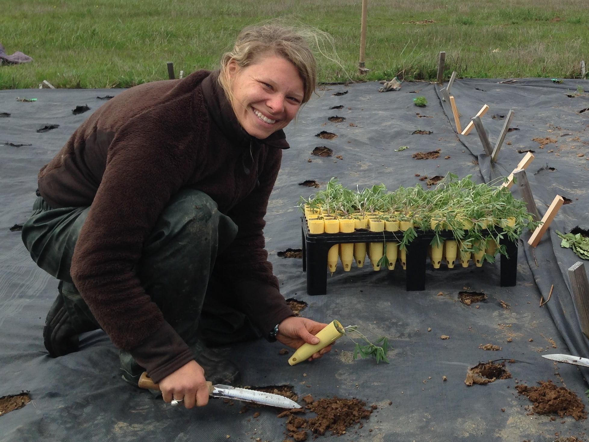 IAE currently manages 66 restoration sites in Oregon and partners with agencies such as the US Fish and Wildlife Service and the Bureau of Land Management (BLM) for plug and seed production. In order to produce seed for restoration, IAE has expanded our farm program to the Oregon State University Vegetable Research Farm, known as the "Veg Farm," just east of the Willamette River in Corvallis, Oregon. The seed that will be harvested from this land will be direct-seeded on to current restoration sites, and used to improve ecosystem functions, restore habitat, and to provide resources for pollinators and wildlife. With much-needed support from IAE staff members across all programs, our 15-strong crew planted thousands of plugs of Oregon iris, barestem biscuitroot, shaggy horkelia, and Western goldenrod in one day this fall.